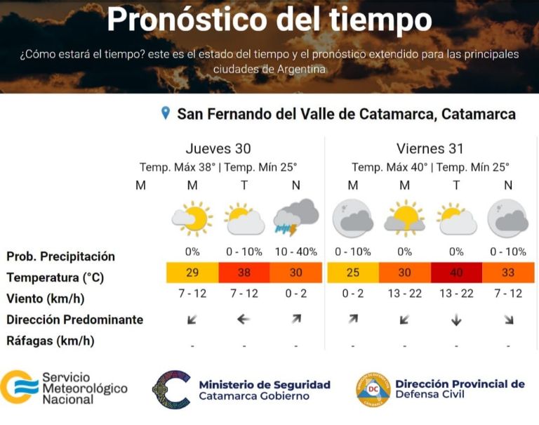 Se esperan temperaturas mínimas de 25° y máximas de 40°, vientos de entre 0 y 22 km/h. y una probabilidad de ocurrencia de lluvias aisladas de entre 0 y 40%.