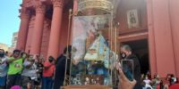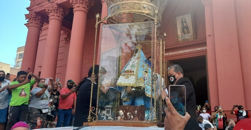 A las 16.00, la Imagen cuatro veces centenaria salió desde su Casa en brazos del Obispo Diocesano, Mons. Luis Urbanc, y en compañía del Pbro. Gustavo Flores, sacerdote encargado de custodiarla todos los días del año, mientras los peregrinos y devotos reunidos en el atrio del templo la recibían con vivas y aplausos. También la imagen del Beato Mamerto Esquiú, uno de sus hijos dilectos, se sumó a la fiesta en este año especial dedicado a reflexionar sobre su figura y su legado, a tres meses de haber sido elevado a los altares.