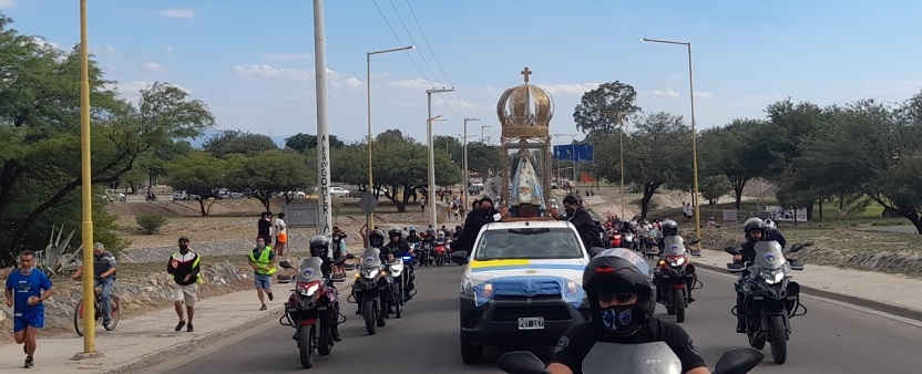 También pasó por algunos templos como la parroquia Santa Rosa de Lima en cuya jurisdicción se encuentra la Gruta, el lugar del hallazgo de la bendita Imagen; el Paseo General Navarro, más conocido como La Alameda, donde fue coronada hace ya 130 años como Reina y Señora de este Valle; en la capilla Santa Teresita el repique de campanas anunciaba su presencia; luego continuó su marcha pasando por la parroquia Jesús Niño y más adelante por la Plazoleta de las Artes ubicada en la manzana del antiguo Hospital San Juan Bautista, hoy centro de expresión artística; la EPET N° 7, continuando hacia el parque. Allí la esperaban peregrinos, ciclistas que arribaban desde las vecinas provincias.