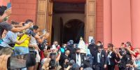 Al final del recorrido, los sones de la Banda de Música de la Policía de la Provincia resonaban con fuerza ante la llegada de la Madre Morena, junto con el Beato Mamerto Esquiú, los corazones se aceleraban y la emoción se confundía con la oración.