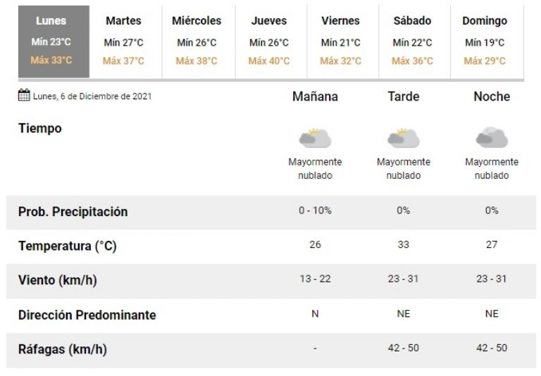 En tanto que se registrarán vientos de entre 0 y 31km/h., ráfagas de entre 42 y 50 km/h. y, una probabilidad de ocurrencia de lluvias aisladas de entre 0% y 10%.