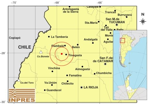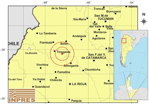 Epicentro: 178 km al NO de La Rioja; 204 km al O de San F. Del Valle De Catamarca; 21 km al O de Tinogasta -28.034 (lat) -67.770 (long)