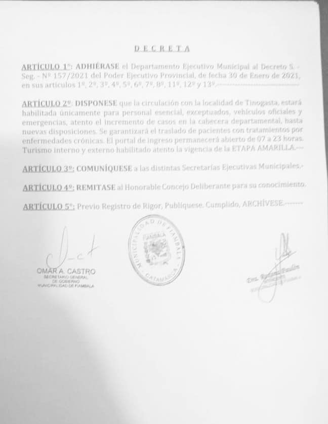 La Municipalidad de Fiambalá informa que mediante el decreto N° 055 dispone el regreso a la Fase Amarilla en toda la jurisdicción.