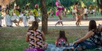 La Batucada El Estilo se abrió paso al ritmo de tambores y trompetas por una de las caminerías centrales del Parque, donde tras hacerse sentir dejó paso a una clase especial de morenada y saya caporal, propuesta por el Profesor Juan Segura, del staff de talleres de la Secretaría de Gestión Cultural, junto al Ballet Argentina.
