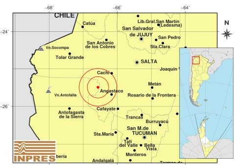 Epicentro: 138 km al SO de Salta; 194 km al SO de San Salvador De Jujuy; 36 km al NO de Angastaco -25.494 (lat) -66.566 (long)