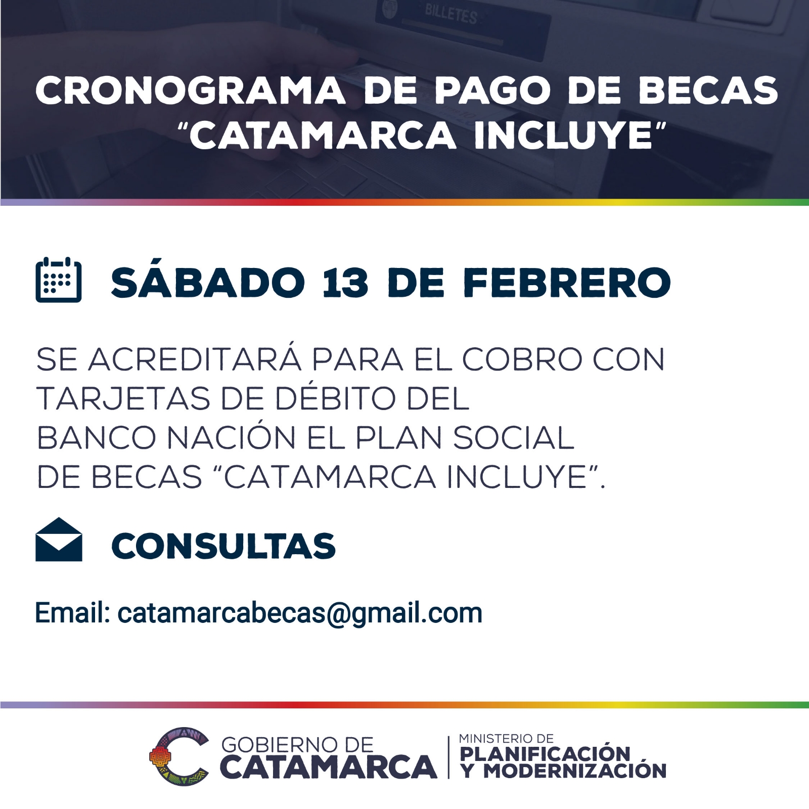 El Ministerio de Planificación y Modernización dio a conocer las fechas de pago para el programa de becas plan social “Catamarca Incluye” del mes de febrero.