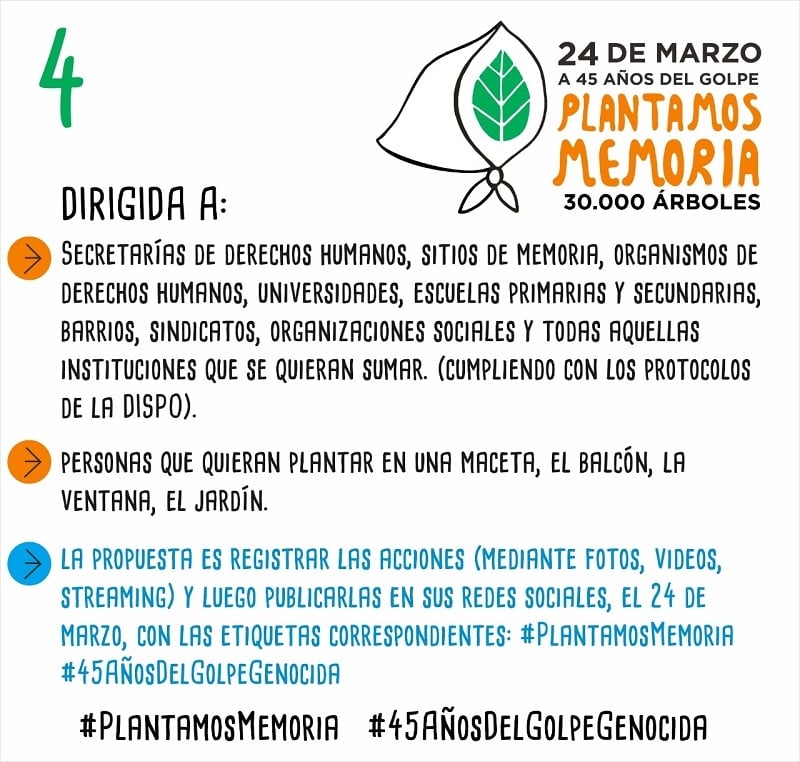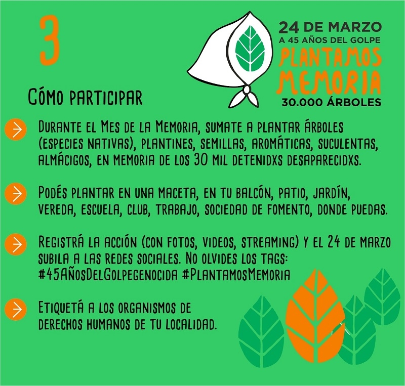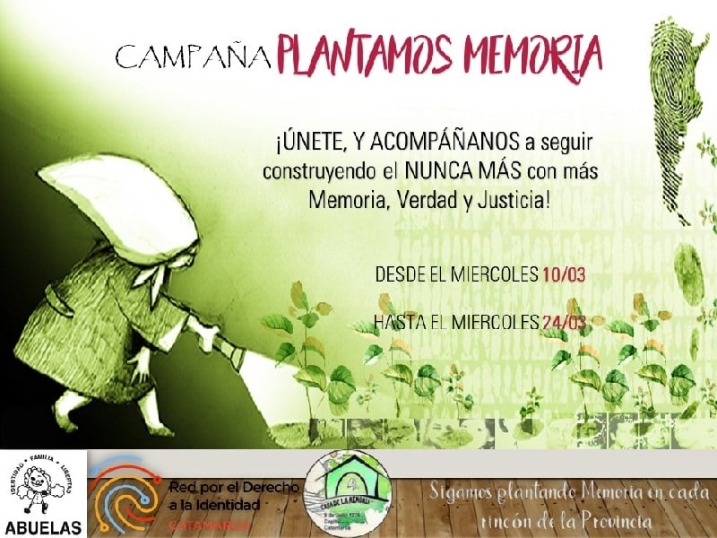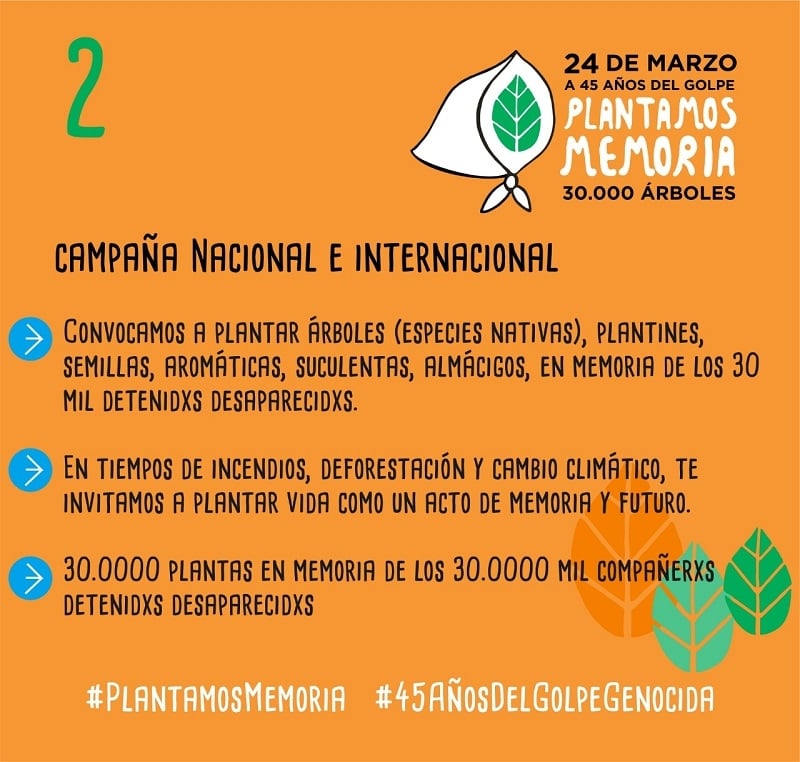 “Durante el Mes de la Memoria, convocamos a plantar árboles, arbustos, plantas aromáticas, suculentas, plantines, almácigos, lo que esté al alcance de sus organizaciones y/o manos, para llegar a 30.000 plantas, en memoria de los 30.000 detenidos desaparecidos”, se transmitió desde esta organización catamarqueña por los Derechos Humanos (DD.HH.).