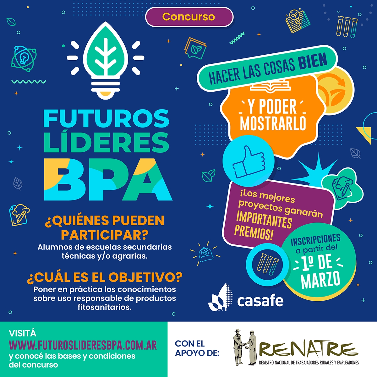CASAFE convoca a los alumnos de escuelas secundarias a demostrar que la implementación de las Buenas Prácticas Agrícolas en el uso de fitosanitarios es posible. Hasta el 14 de abril, está abierta la inscripción al concurso Futuros Líderes BPA, para más información ingresar a http://futuroslideresBPA.com.ar.