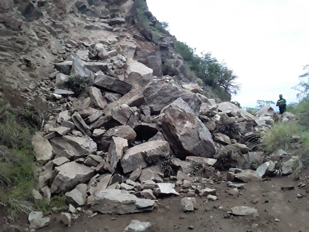 Luego de varios días de temporal, la cuesta de La Chilca se encuentra intransitable por un derrumbe, cuyo material pedregoso atraviesa toda la calzada.