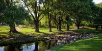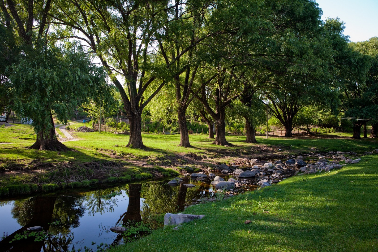 Al costado de la plaza cruza un río manso, con verdes y prolijas costas, ideal para que jueguen los niños, mientras se cocina el asado o disfrutamos del sol.