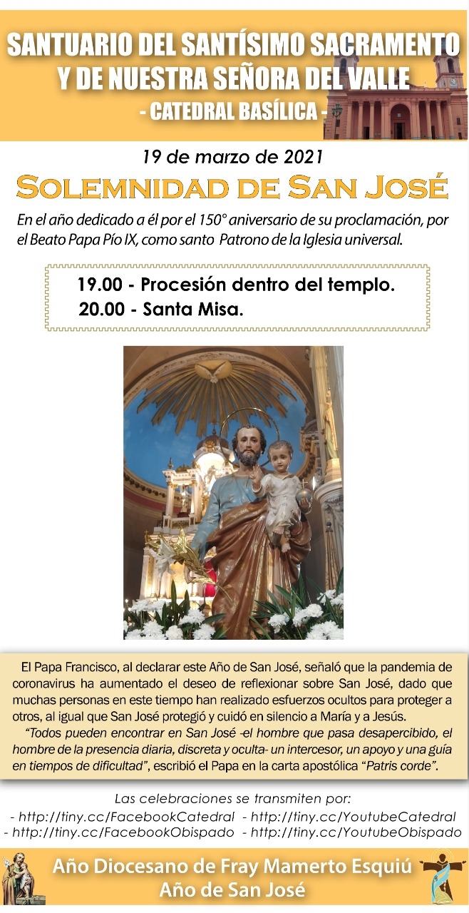 En el Año Jubilar dedicado a San José, esposo de María Virgen, la parroquia Jesús Niño celebra la novena en la sede parroquial. A partir de las 20, se reza el Santo Rosario y a las 20.30 se celebra la Santa Misa. Se reflexiona sobre la Carta Apostólica del Papa Francisco "Patris Corde".
