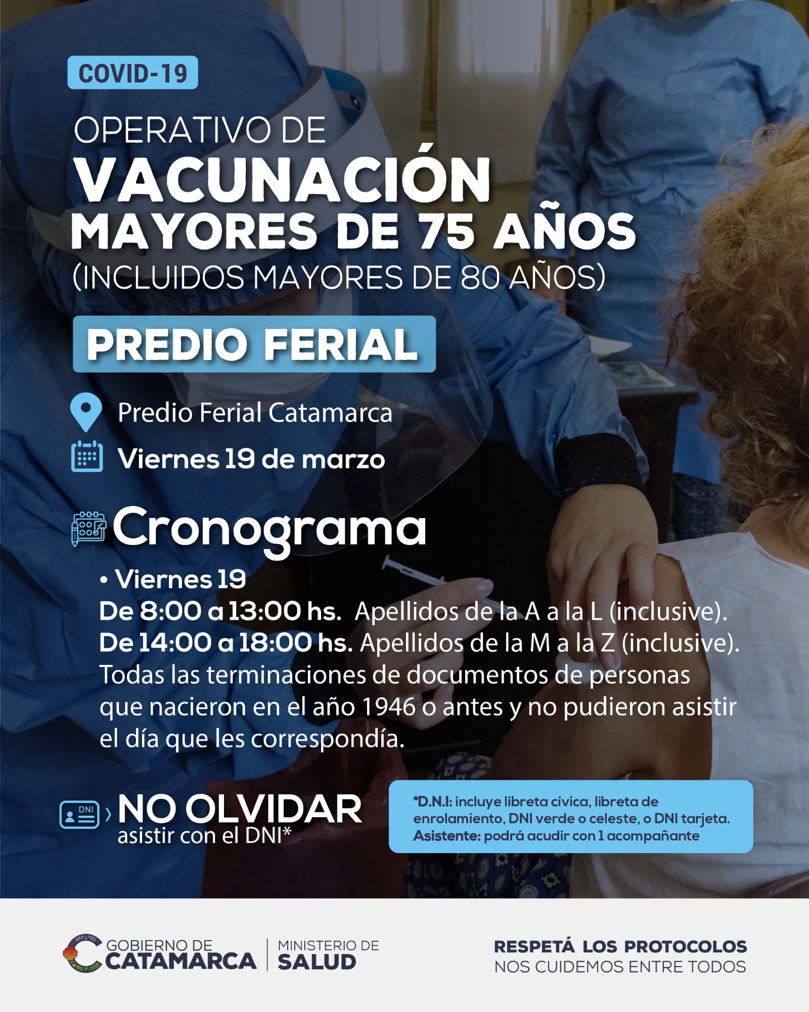 Por este día, podrán asistir personas con cualquier terminación de documento, pero en el horario que se le asigna según la primera letra de su apellido, por la mañana de la A a la L y por la tarde, se la M a la Z. Todos quienes asistan a recibir su vacuna deben llevar documento de identidad para acreditar edad y domicilio.