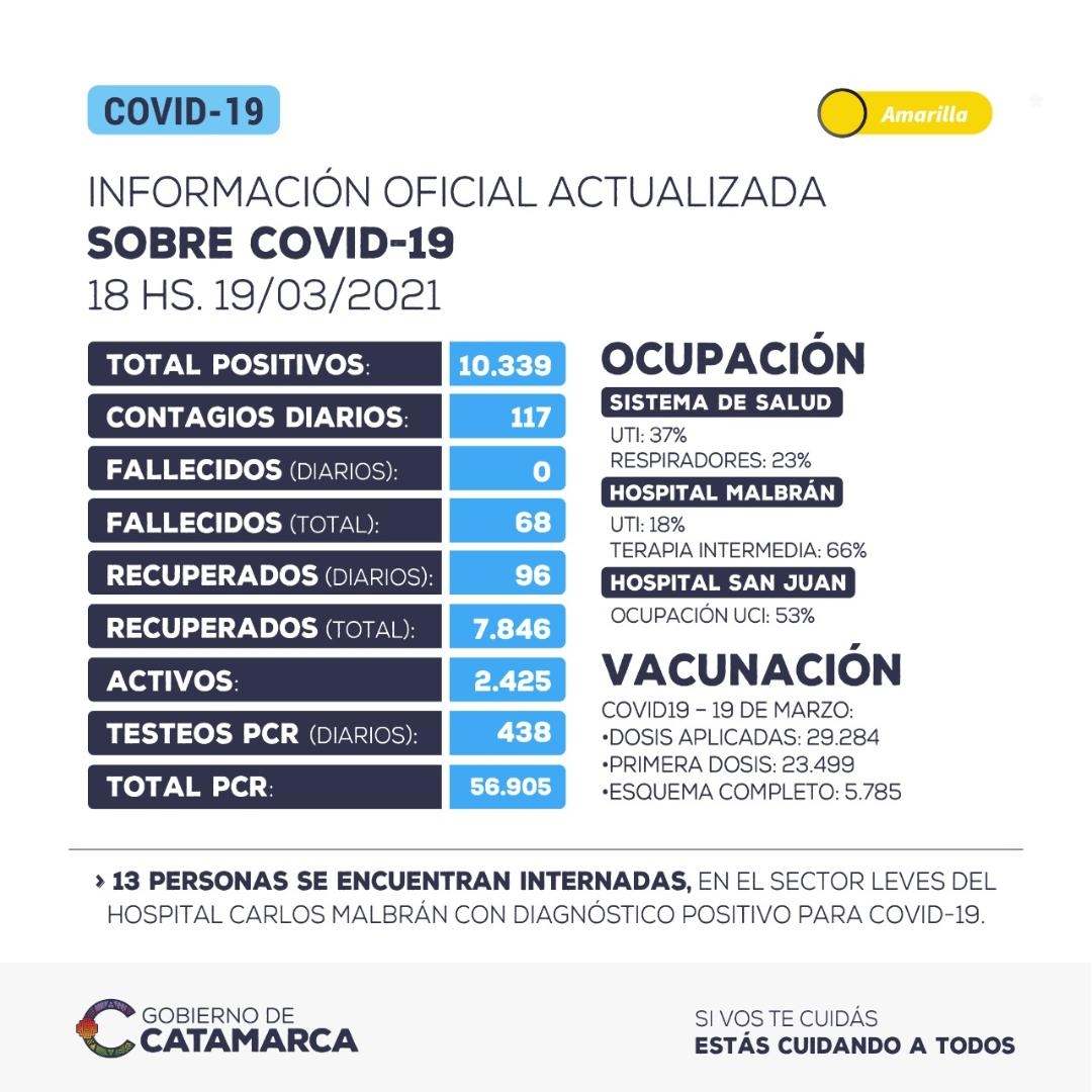 Los casos positivos detectados hoy corresponden a Capital (62), Valle Viejo (24), Fray Mamerto Esquiú (7), La Paz (6), Capayán (5), Andalgalá (5), Santa Rosa (5), Santa María (2) y Pomán (1).