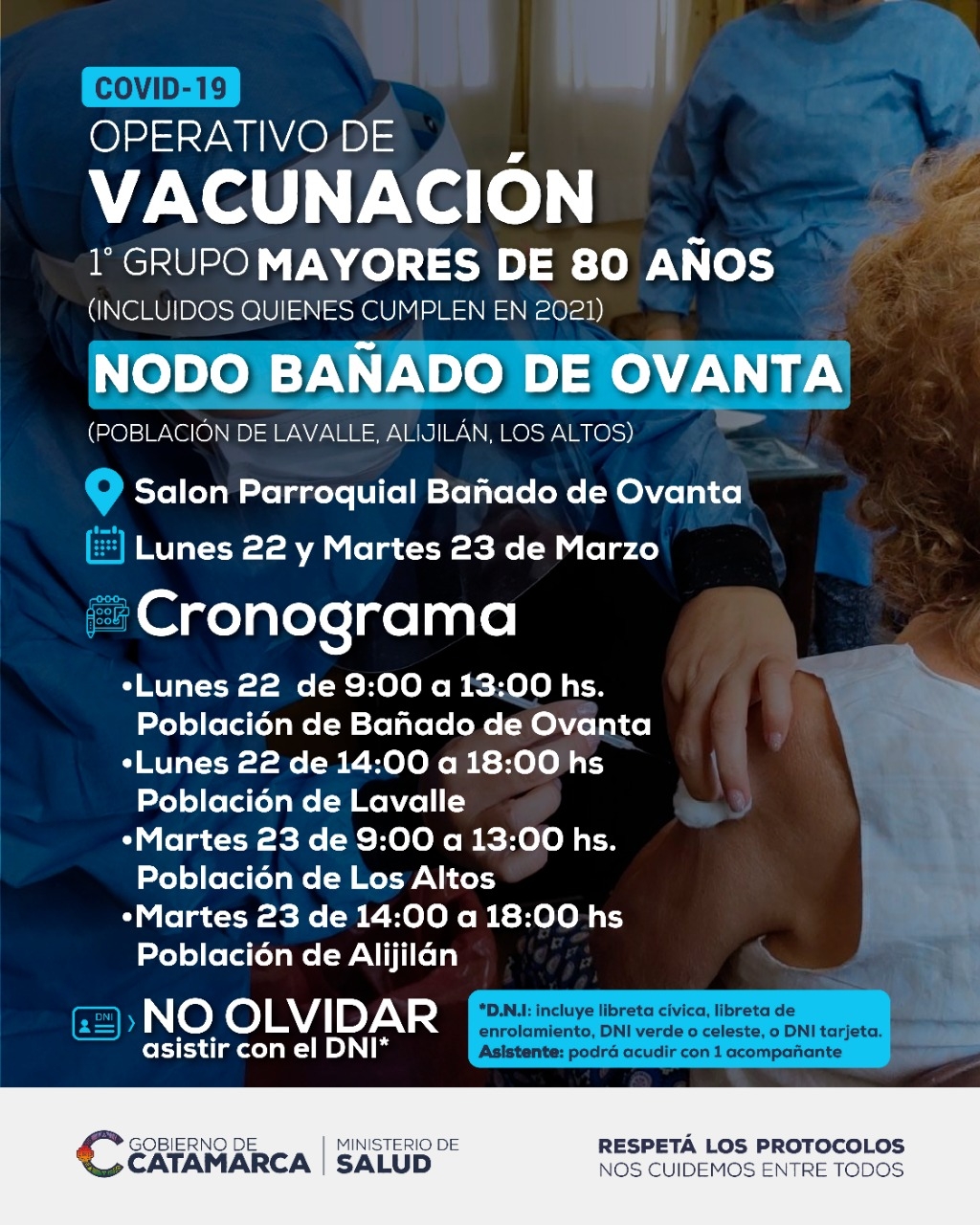 Por un lado, en el Nodo Bañado de Ovanta que funcionará en el Salón Parroquial, se vacunará a mayores nacidos en 1941 o antes de Lavalle, Alijilán y de Bañado de Ovanta. El lunes 22 por la mañana en horario de 9 a 13 se vacunará a los pobladores de Bañado de Ovanta y por la tarde, de 14 a 18 horas a los de Lavalle. El día martes 23, por la mañana (9 a 13) recibirán sus dosis personas de Los Altos y, por la tarde (14 a 18) las de Alijilán.