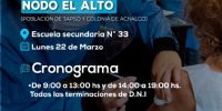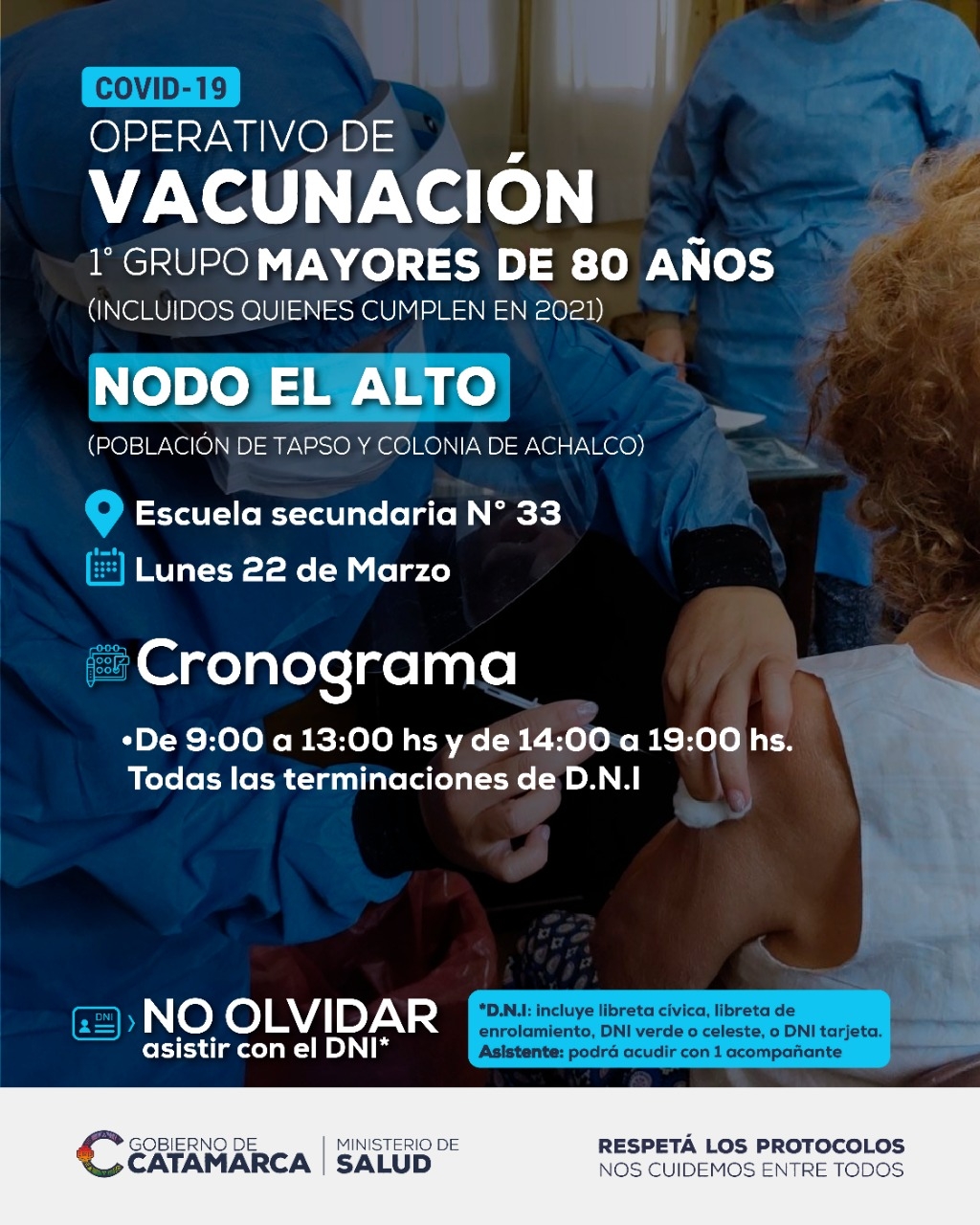 Por otra parte, destinado a la vacunación de ese mismo grupo etario (más de 80), también mañana lunes 22 comenzarán a vacunar en el Nodo El Alto. Estará localizado en la Escuela secundaria N°33 y se inocularán personas con residencia en Tapso y Colonia de Achalco en turno matutino (9 a 13) y vespertino (14 a 19).