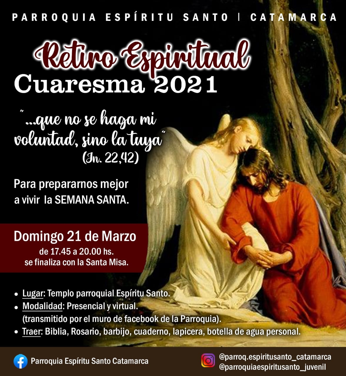 La modalidad será presencial y virtual, con transmisión a través del facebook Parroquia Espíritu Santo Catamarca, y por instagram @parroq.espiritusanto_catamarca / @parroquiaespiritusanto_juvenil.