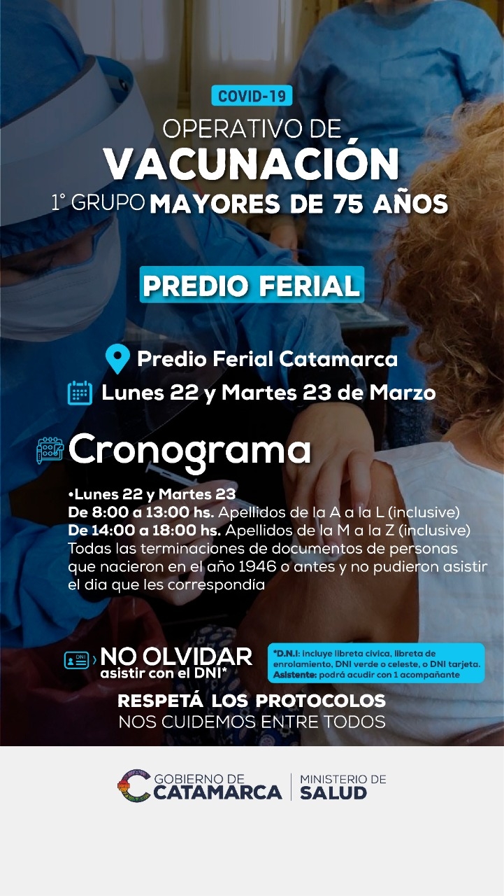 En este sentido, deben presentarse en el Predio todas aquellas personas que cumplieron o cumplen 75 años o más, durante este año y que aún no hayan sido vacunadas. Deberán presentarse en el Predio con documento de identidad; por la mañana (de 8 a 13 horas) aquellas personas cuyo apellido comience con la A hasta la L inclusive y, por la tarde (de 14 a 18 horas), las que tengan apellido que comienzan con las letras de la M a la Z.