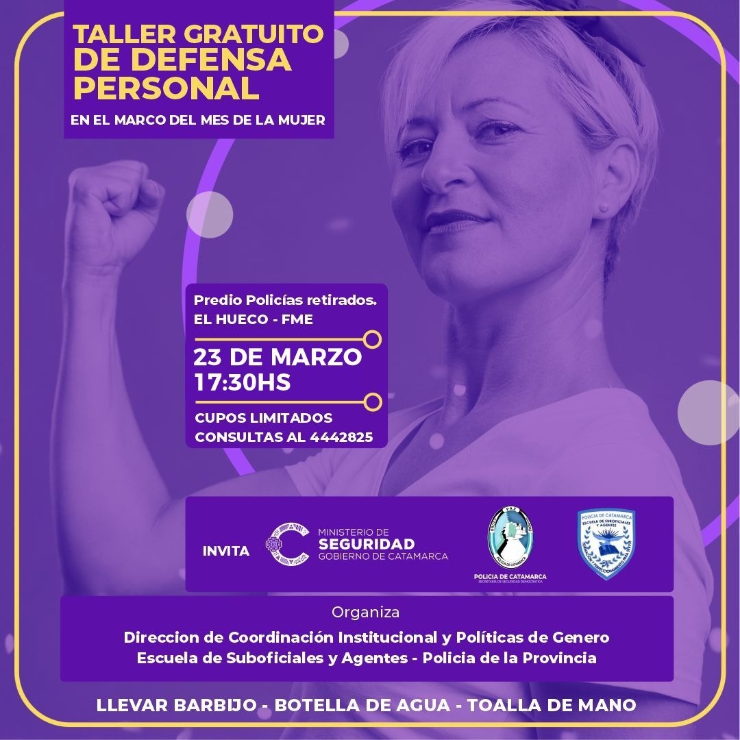 Estos talleres están a cargo de la Escuela de Suboficiales y Agentes de la Escuela de Policía de Catamarca y se pretende que las mujeres puedan adquirir una serie de conocimientos, técnicos y estrategias defensivas para su seguridad física, ante situaciones o agresiones físicas.