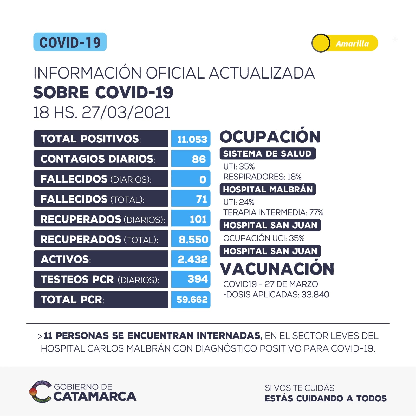 Hasta las 18 horas del sábado 27 de marzo, se han detectado 86 nuevos casos positivos de coronavirus en la provincia de Catamarca. El total acumulado de casos positivos detectados asciende a 11.053.