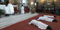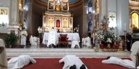 A continuación, se rezaron las Letanías de todos los Santos, los candidatos se postraron completamente, significando su entrega total y eterna al servicio de la Iglesia, mientras el Obispo, el presbiterio y toda la asamblea se puso de rodillas rogando a Dios por sus vocaciones en unión con toda la Iglesia.