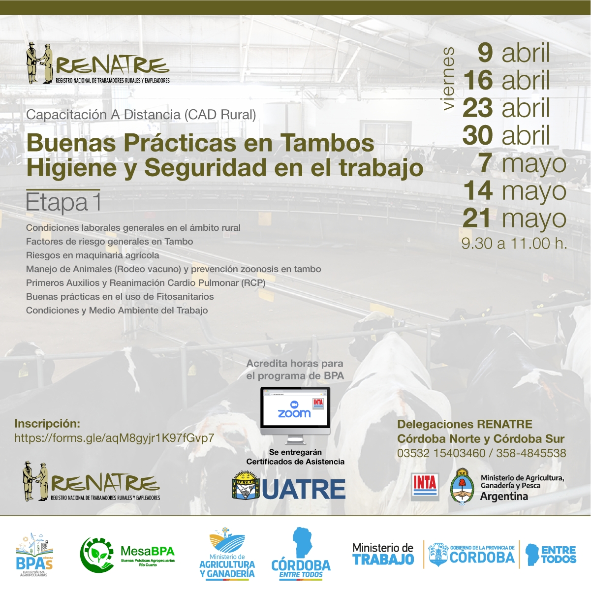 Las Delegaciones del RENATRE en Córdoba Norte y Córdoba Sur, junto al INTA, la UATRE, Ministerio de Trabajo de la provincia y Ministerio de Agricultura y Ganadería de la provincia, comienzan un ciclo de capacitaciones sobre “Buenas Prácticas en Tambos- Higiene y Seguridad en el trabajo”, el próximo 9 de abril.
