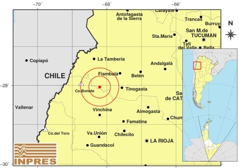 Epicentro: 202 km al NO de La Rioja; 246 km al O de San F. Del Valle De Catamarca; 64 km al O de Tinogasta -28.043 (lat) -68.207 (long)