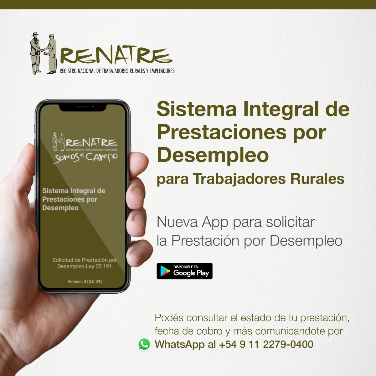 El RENATRE (Registro Nacional de Trabajadores Rurales y Empleadores) lanzó su primera aplicación para teléfonos celulares, desde la cual los trabajadores rurales podrán gestionar íntegramente la solicitud de Prestación por Desempleo. A su vez, incorporó una línea de WhatsApp automatizada (+54 911 2279-0400) para expandir la atención y acceder de forma rápida y fácil a la información sobre el estado de su prestación en tiempo real.