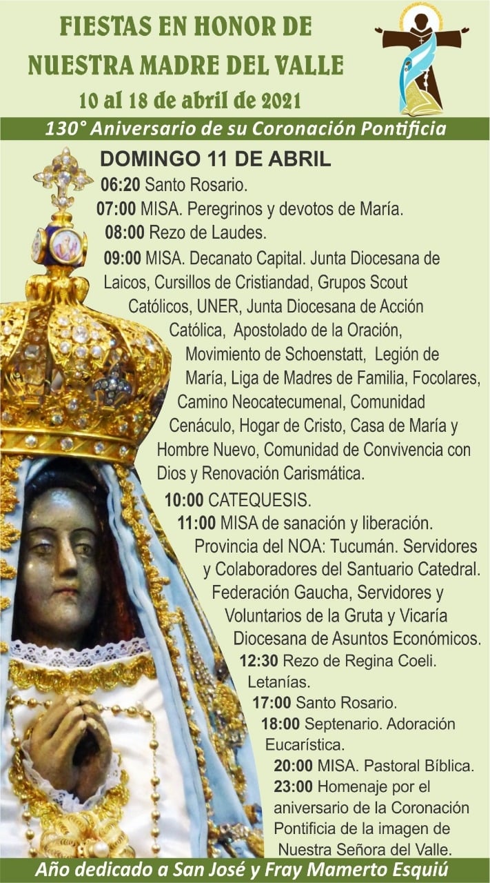Por segundo año consecutivo, Dios permite que nuestro septenario lo comencemos de manera virtual, lo cual a no pocos les resulta cada vez más extraño y, en cierta manera, molesto. No obstante, demos gracias a Dios que al menos así lo podemos hacer y le brindemos nuestro homenaje a la Virgen del Valle haciendo un esfuerzo mayor por cuidarnos y respetar las normas de convivencia en medio de la pandemia. Le pidamos a la Morenita que nos armemos de paciencia y prudencia a la hora de interactuar, de concurrir a nuestros trabajos, de celebrar acontecimientos familiares, de ir a hacer diligencias, de participar de celebraciones cultuales, de asistir a lugares cerrados, de cuidar a enfermos, etc. Tenemos necesidad de ser muy responsables y solidarios a fin de poder controlar los efectos de la virulencia del virus. San José y su casta esposa, María Santísima, nos ayuden y acompañen a lo largo de estos días a impetrar del Buen Dios la gracia de la superación de la pandemia, a ser mejores hijos de Dios y a ser verdaderos hermanos los unos de los otros, construyendo una cultura en base a los valores del Evangelio, de modo que en todos los hogares catamarqueños reconozcamos y proclamemos a Cristo Resucitado, vivo y operante en la vida de cada bautizado y en la sociedad toda.