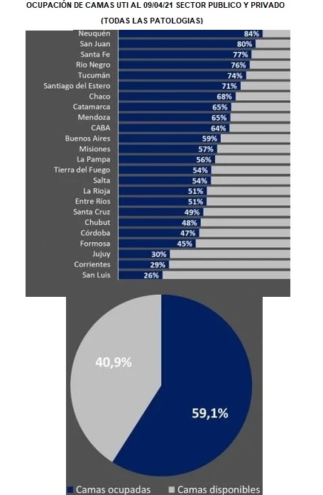 La Provincia de Buenos Aires, el distrito más grande y poblado del país, cuenta con una ocupación del 59% de las camas destinadas a pacientes que requieren cuidados críticos (en el Gran Buenos Aires el porcentaje es del 68,5%). Misiones llega a un 57%, La Pampa a un 56% y Tierra de Fuego y Salta, un 54%.