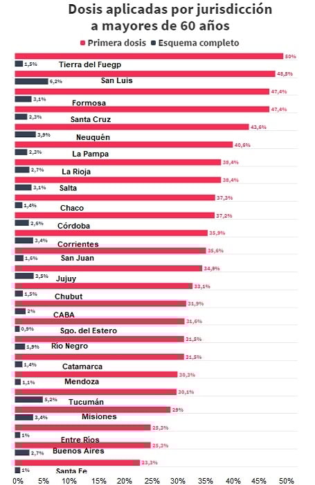 En el caso de los mayores de 60 años, Tierra del Fuego es la provincia argentina que más personas vacunadas tiene, con un 50% que recibieron la primera dosis, seguida por San Luis (48,5%) y Formosa (47,4%). Las provincias que menos porcentaje alcanzaron son Entre Ríos y Buenos Aires (25,3%), y Santa Fe (23,3%).