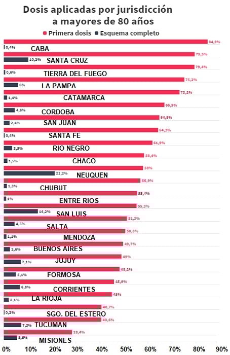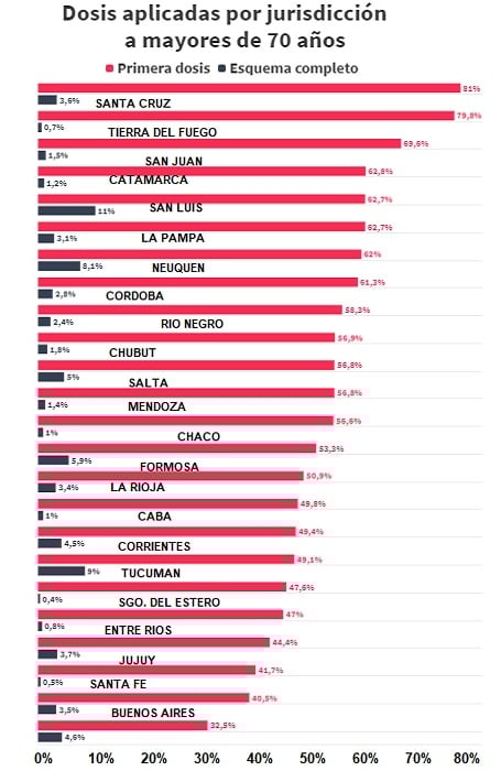 Si el corte se hiciese para los mayores de 80 años, se observa que CABA inmunizó al 84,9% de este grupo etario con la primera dosis, Santa Cruz al 79,5% y Tierra del Fuego al 79,4%, quedando muy cerca de completar la vacunación. Quienes tienen los porcentajes más bajos son Santiago del Estero (40,7%), Tucumán (40,6%) y Misiones (28,4%).