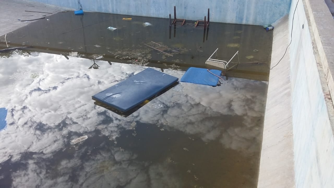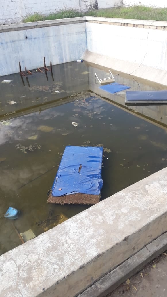 Según publica Radio Valle Viejo, la pileta está abandonada y con agua estancada, elementos deportivos acumulados en su interior, oficinas con sus vidrios destrozados, saqueo de equipamiento, son algunas de las imágenes que se pueden observar.