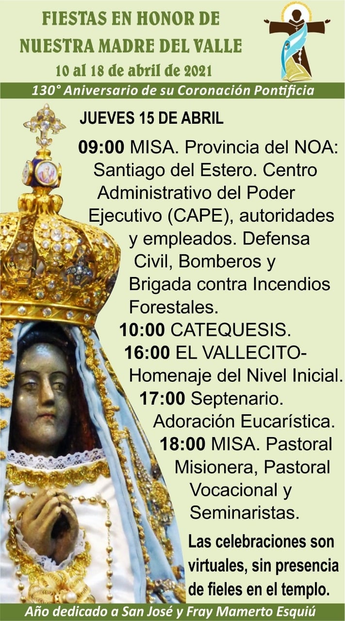 09:00 MISA. Provincia del NOA: Santiago del Estero. Centro Administrativo del Poder Ejecutivo (CAPE), autoridades y empleados. Defensa Civil, Bomberos y Brigada contra Incendios Forestales.