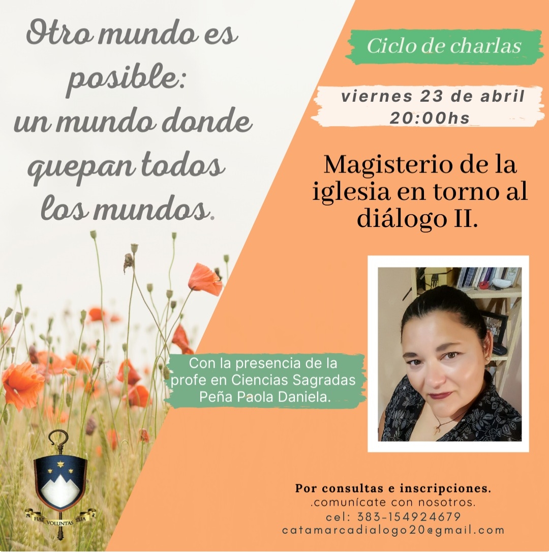 En esta oportunidad, se contará con la presencia de Paola Daniela Peña, profesora en Ciencias Sagradas, quien abordará "El Magisterio de la Iglesia en torno al Diálogo II".