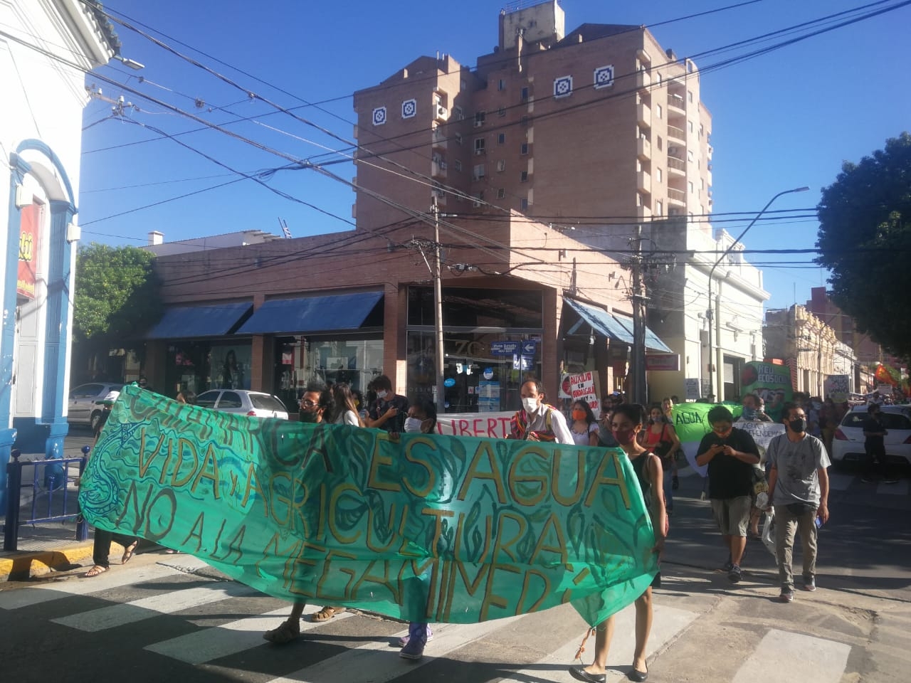 Además, en el marco de la movilización, levantan bandera con mensajes en contra de la actividad minera en la provincia.