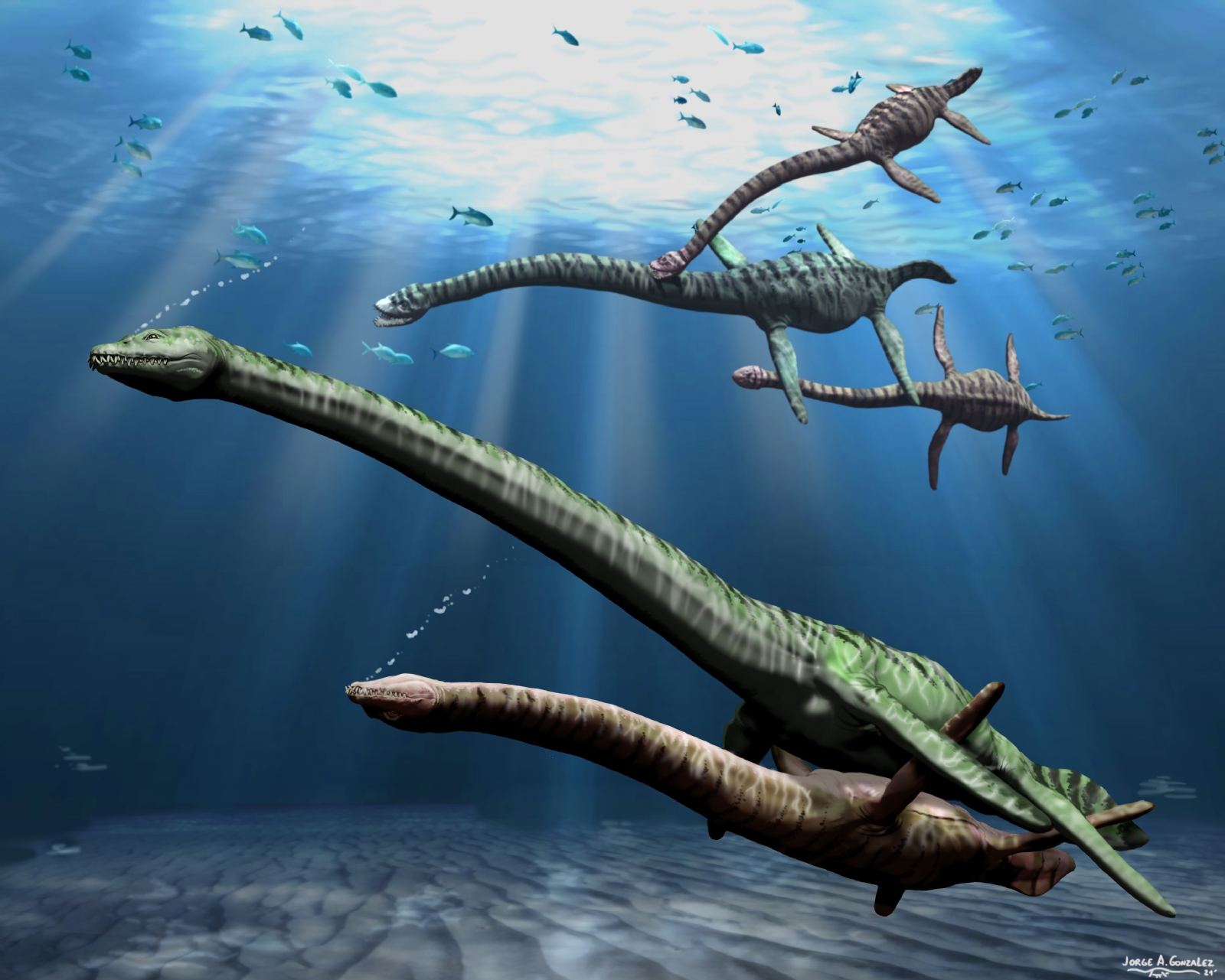 “En el caso de Kawanectes lafquenianum, se observan tanto diferencias de tamaño como en las proporciones de los miembros anteriores y posteriores”, aseveró O’Gorman. Y agregó: “Estos animales medían entre tres y cuatro metros, y las hembras eran más grandes que los machos”.