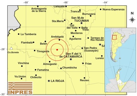 Epicentro: 82 km al NO de San F. Del Valle De Catamarca; 159 km al N de La Rioja; 51 km al S de Andalgalá -28.025 (lat) -66.430 (long)