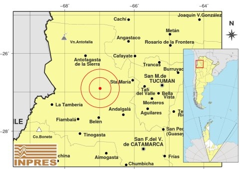 Epicentro: 178 km al O de San Miguel De Tucumán; 211 km al NO de San F. Del Valle De Catamarca; 83 km al N de Belén -26.904 (lat) -66.985 (long)