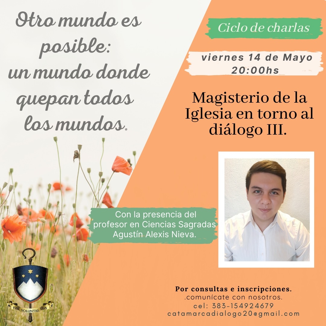 La charla estará a cargo de Agustín Alexis Nieva, profesor en Ciencias Sagradas, quien se referirá al "Magisterio de la Iglesia en torno al Diálogo III".