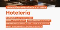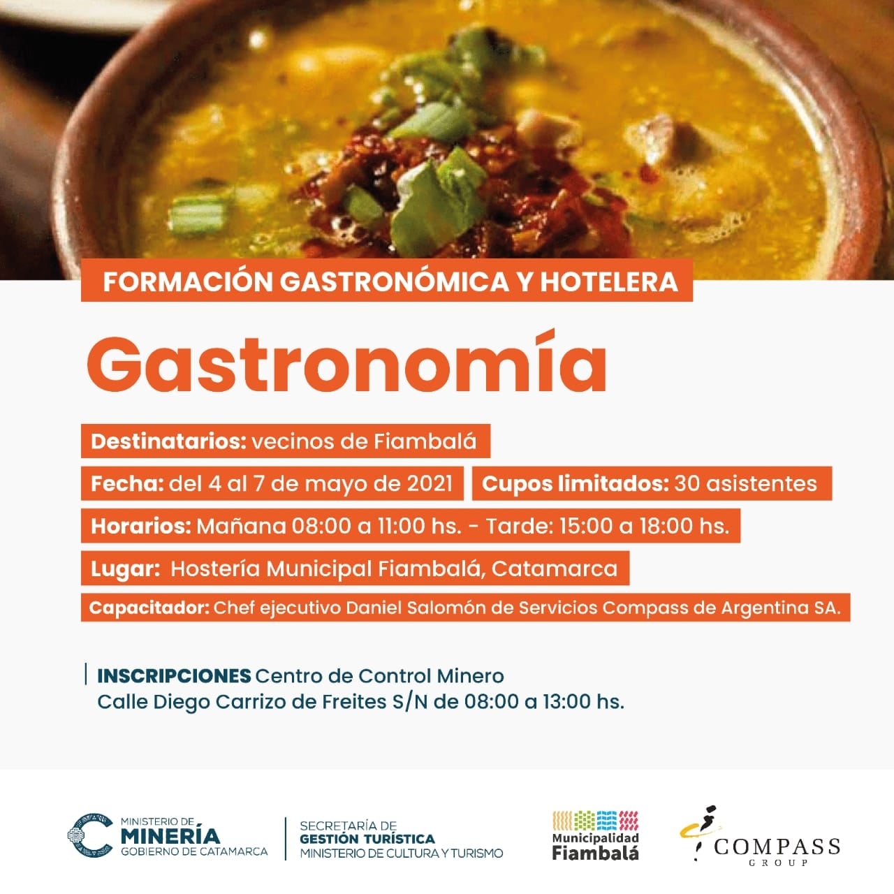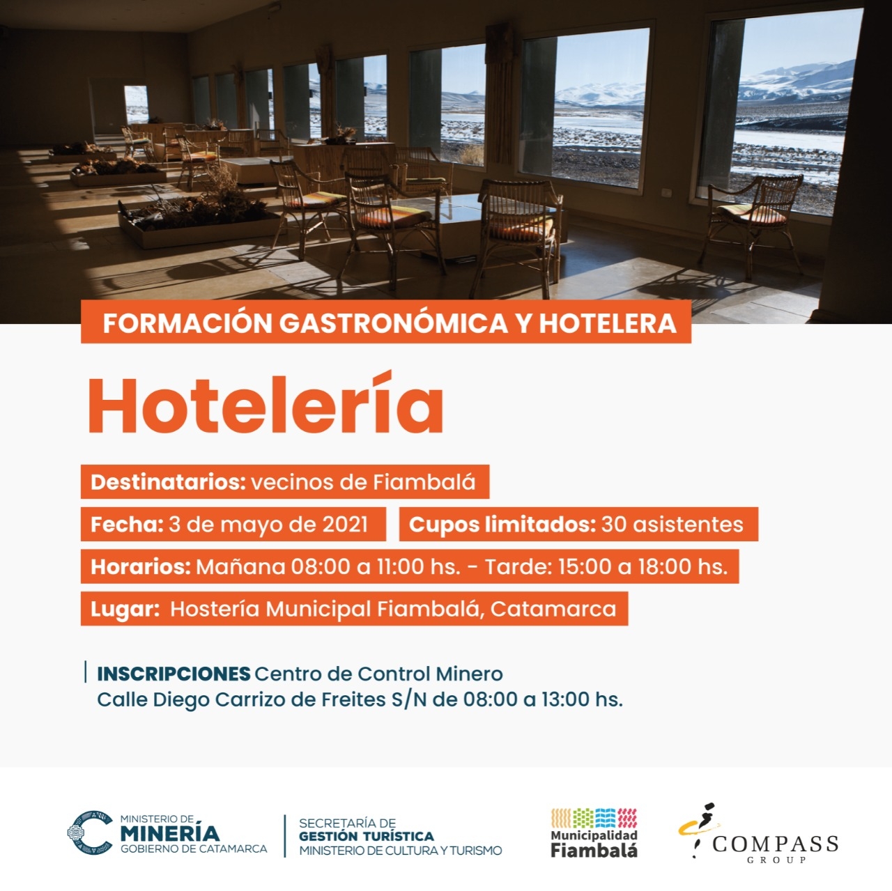El Ministerio de Minería de la provincia, junto a la Secretaria de Gestión Turística del Ministerio de Cultura y Turismo, la Municipalidad de Fiambalá y el Grupo Compass invitan a los cursos de Gastronomía y Hotelería que se desarrollarán en el marco de las capacitaciones referidas a la “Formación Gastronómica y Hotelera” en ese municipio.