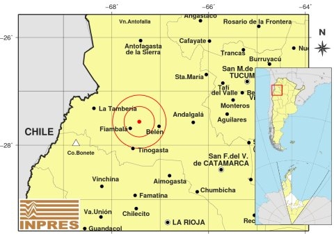 Epicentro: 193 km al NO de San F. Del Valle De Catamarca; 212 km al N de La Rioja; 22 km al NE de Fiambalá -27.568 (lat) -67.432 (long)