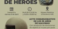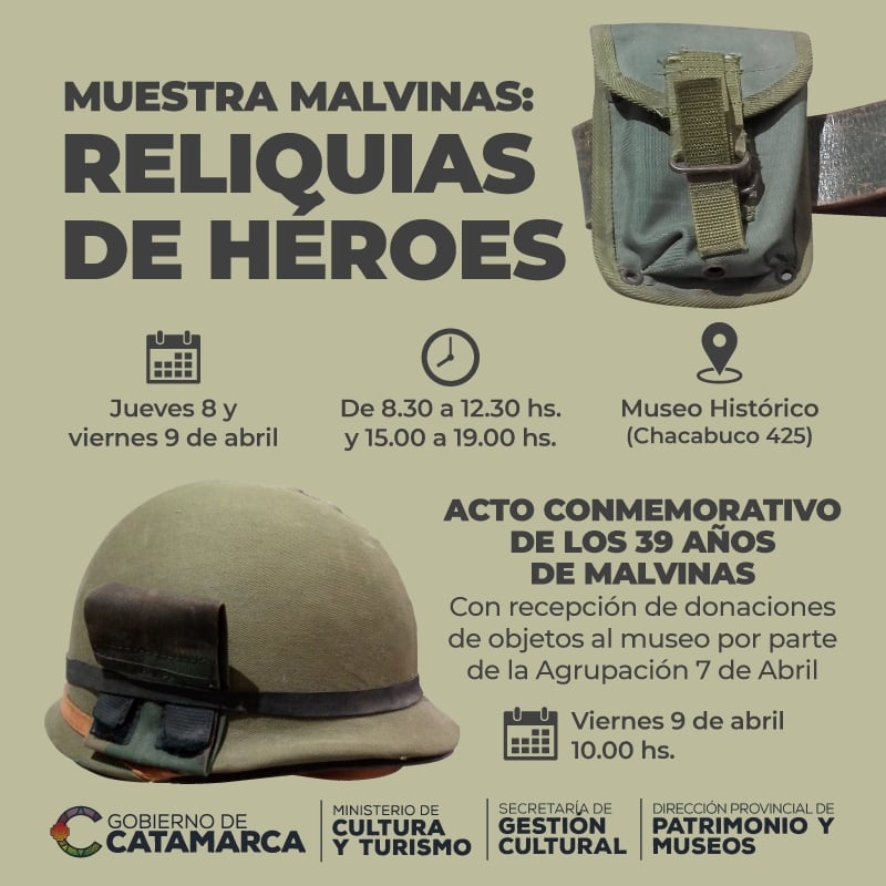 La Muestra “Malvinas: Reliquias de Héroes” estará expuesta al público en la sede del Museo Histórico, calle Chacabuco 425, los días jueves 8 y viernes 9 de abril de 8,30 a 12,30 y de 15 a 19 hs. En la oportunidad, en las galerías y patios del Museo Histórico se exhibirán objetos propiedad de los veteranos y otros donados a la institución.
