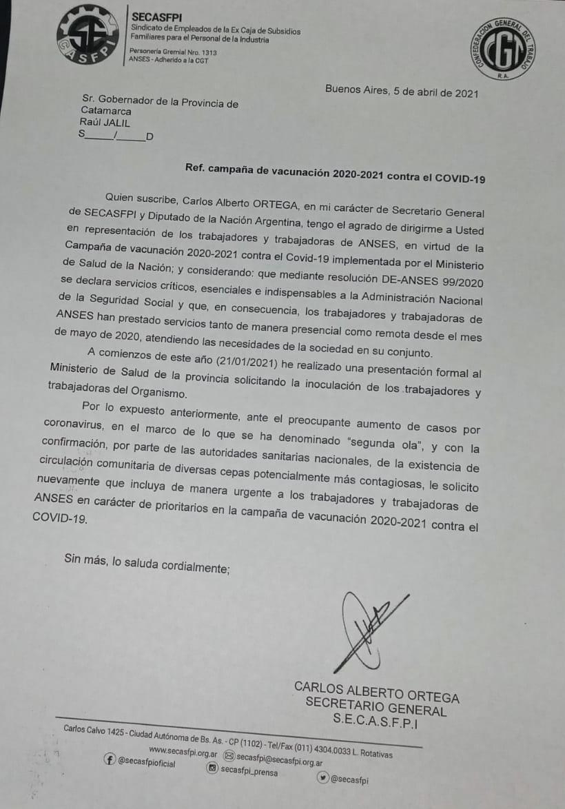 Es para insistir en la inclusión de forma prioritaria de todos los trabajadores y trabajadoras en la campaña de vacunación contra el COVID-19, impulsada por el Ministerio de Salud de la Nación, dado el carácter esencial de los servicios que brinda la ANSES.
