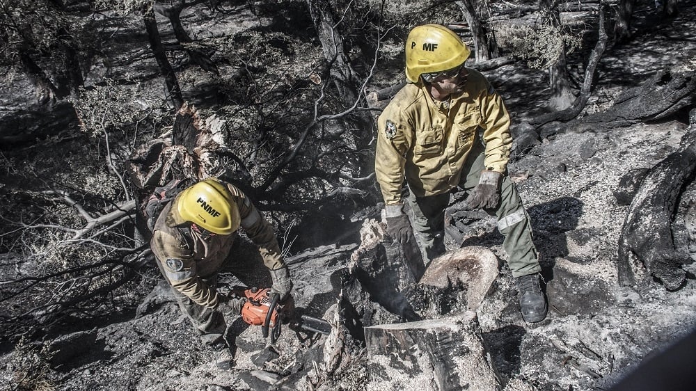 El personal de Catamarca, conjuntamente con Jujuy, afrontó el combate de la zona norte del Incendio que incluyó montañas boscosas con abundante “mantillo” en El Maitén y El Hoyo, donde las tareas principales fueron la detección de hornos o fuegos subterráneos y puntos calientes a lo largo de todo el perímetro con herramientas de zapa para la realización de brechas y fajas corta fugo, motosierras para la eliminación de árboles de gran porte con actividad ígnea en su interior y herramientas cortantes para la limpieza de zonas con continuidad de vegetación, posibles generadoras de focos secundarios. En tanto que en la zona sur del incendio trabajaron combatientes de San Luis, Córdoba, Bariloche, Brigada Nacional y Chubut.
