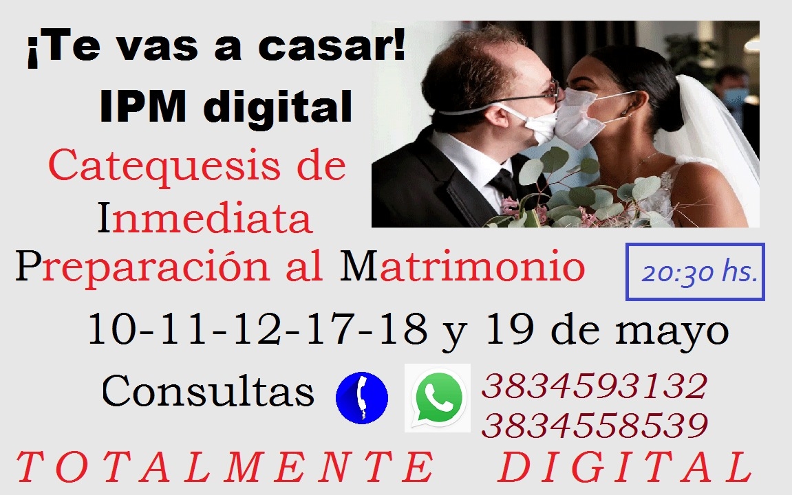 El lunes 10 de mayo, a partir de las 20.30, comienza la catequesis de Inmediata Preparación al Matrimonio (IPM) para quienes se van a casar. Debido a la situación epidemiológica, los encuentros se realizarán de manera virtual.