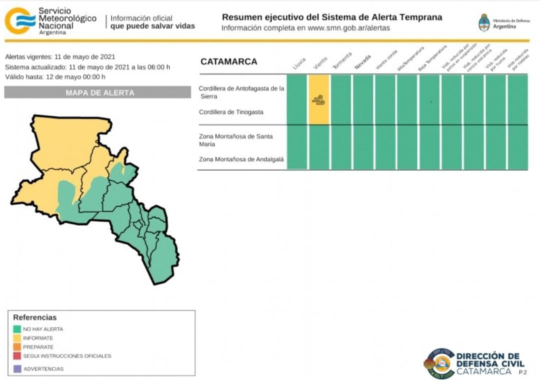 Por vientos fuertes para hoy martes 11, afectando las zonas de Cordillera de Antofagasta de la Sierra y Cordillera de Tinogasta.