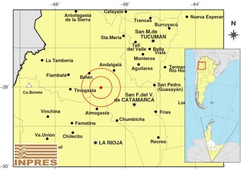 Epicentro: 141 km al N de La Rioja; 163 km al O de San F. Del Valle De Catamarca; 26 km al SE de Tinogasta -28.233 (lat) -67.388 (long)