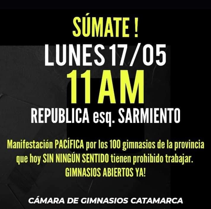 De esta manera, convocaron para hoy lunes a una manifestación pacífica en calle República esquina Sarmiento, solicitando que la actividad física sea declarada esencial.
