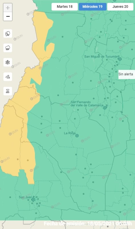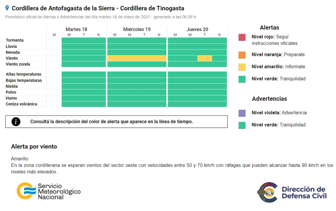 El Sistema de Alerta Temprana emitió una alerta amarilla por vientos para mañana miércoles 19 y este jueves 26, afectando las zonas de cordillera de Antofagasta de la Sierra y cordillera de Tinogasta.