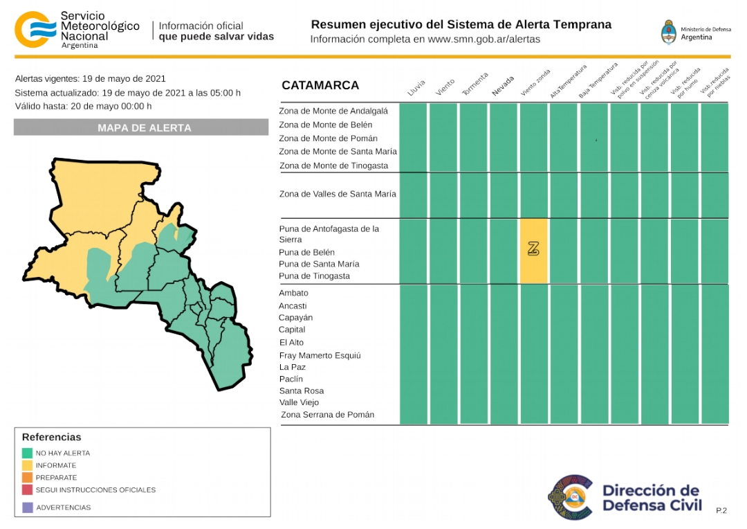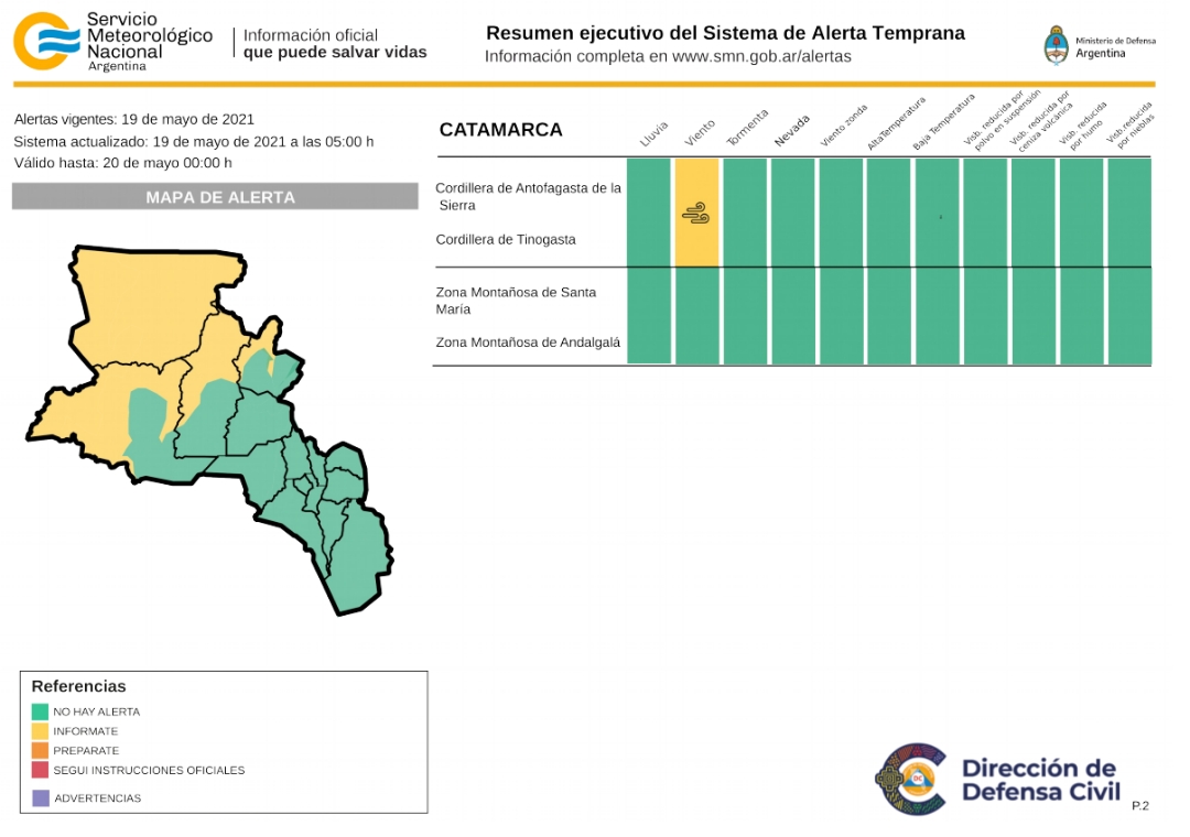 La primera alerta es por vientos fuertes que rige desde hoy miércoles 19 hasta el día viernes 21, afectando las zonas de cordillera de Antofagasta de la Sierra y cordillera de Tinogasta.